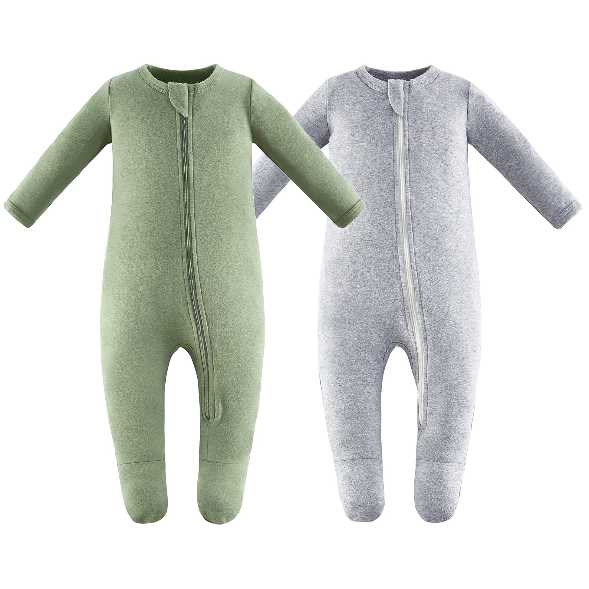 100% Cotton Footed Zip Pajamas - 2 pack - Gray Melange & Sage Green