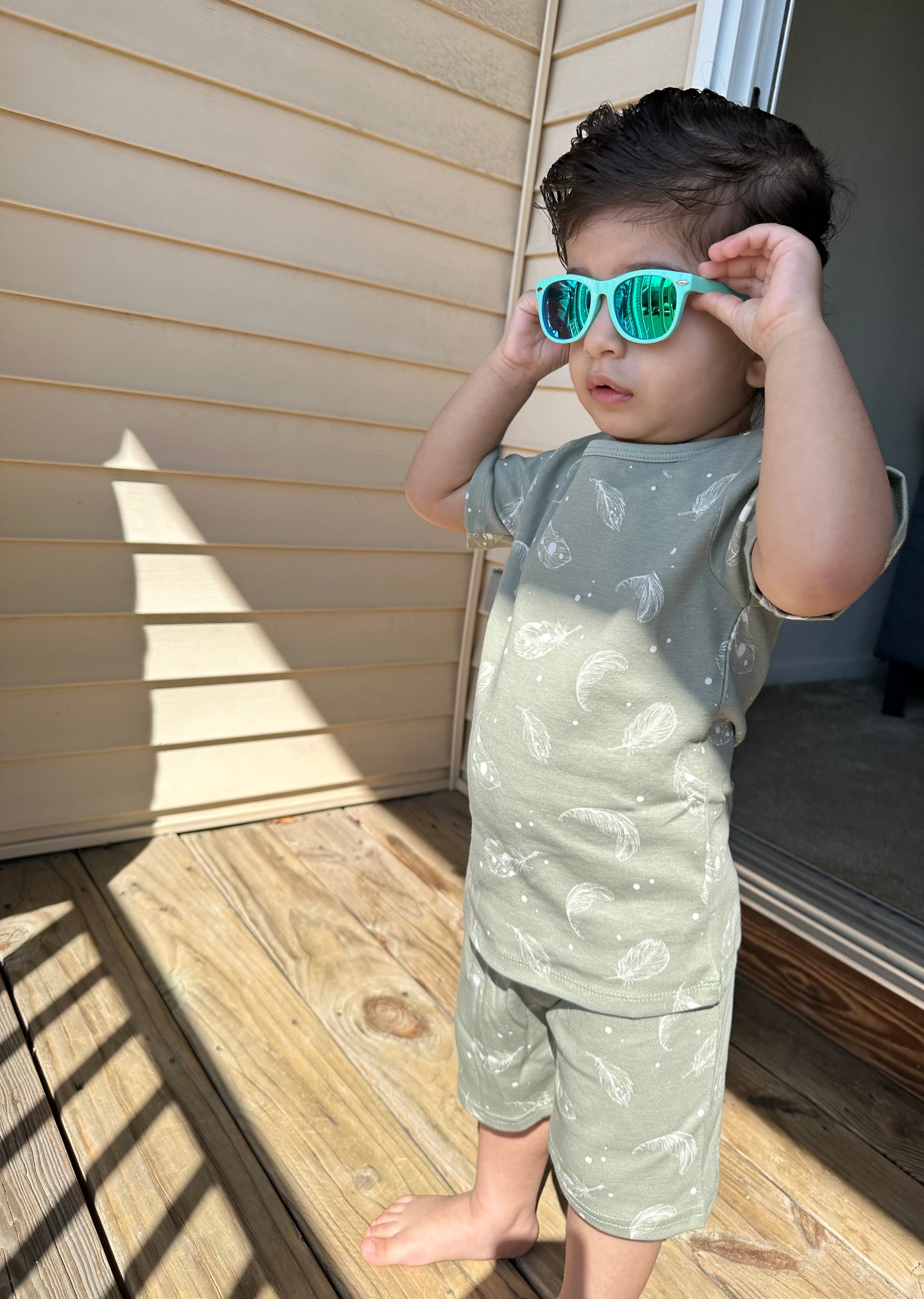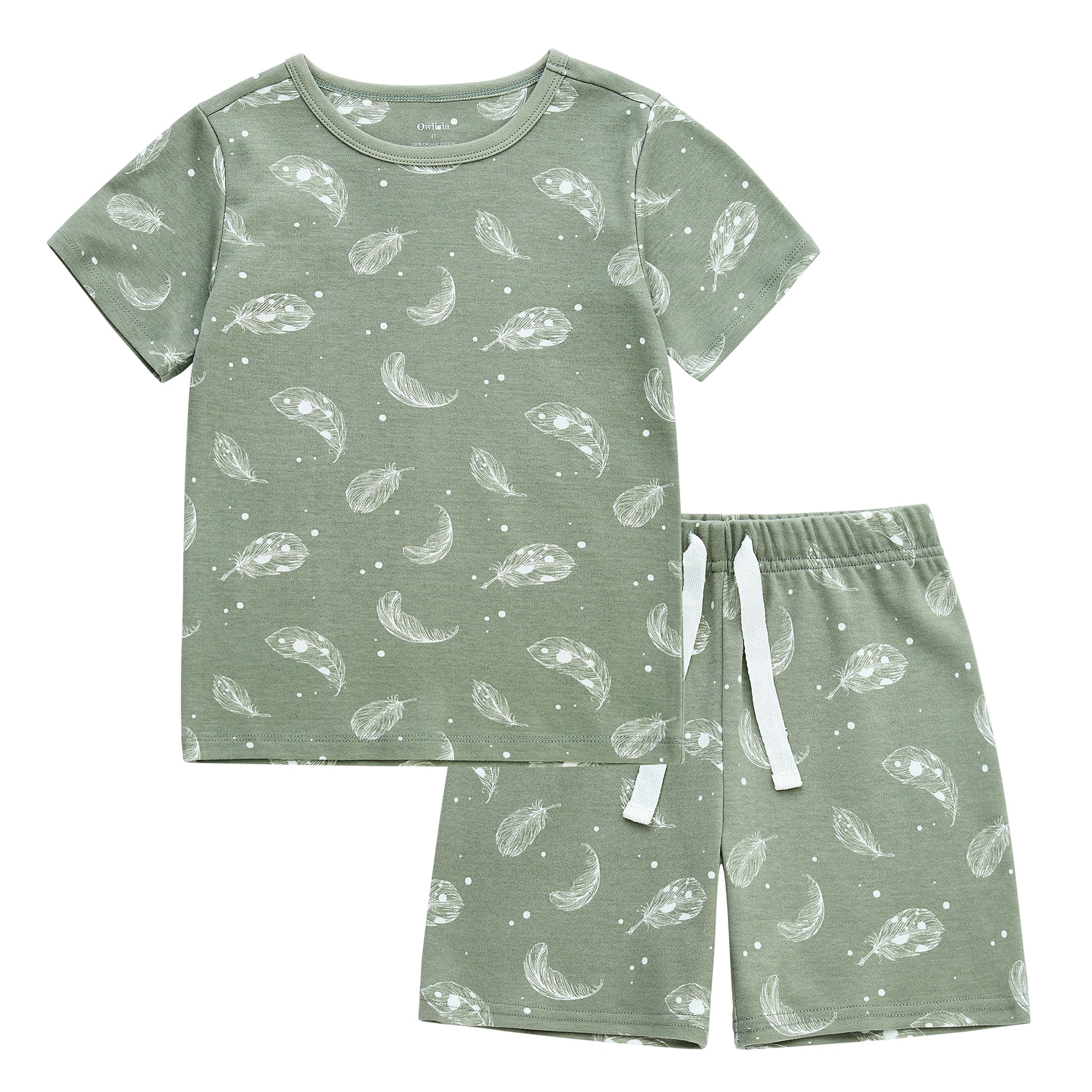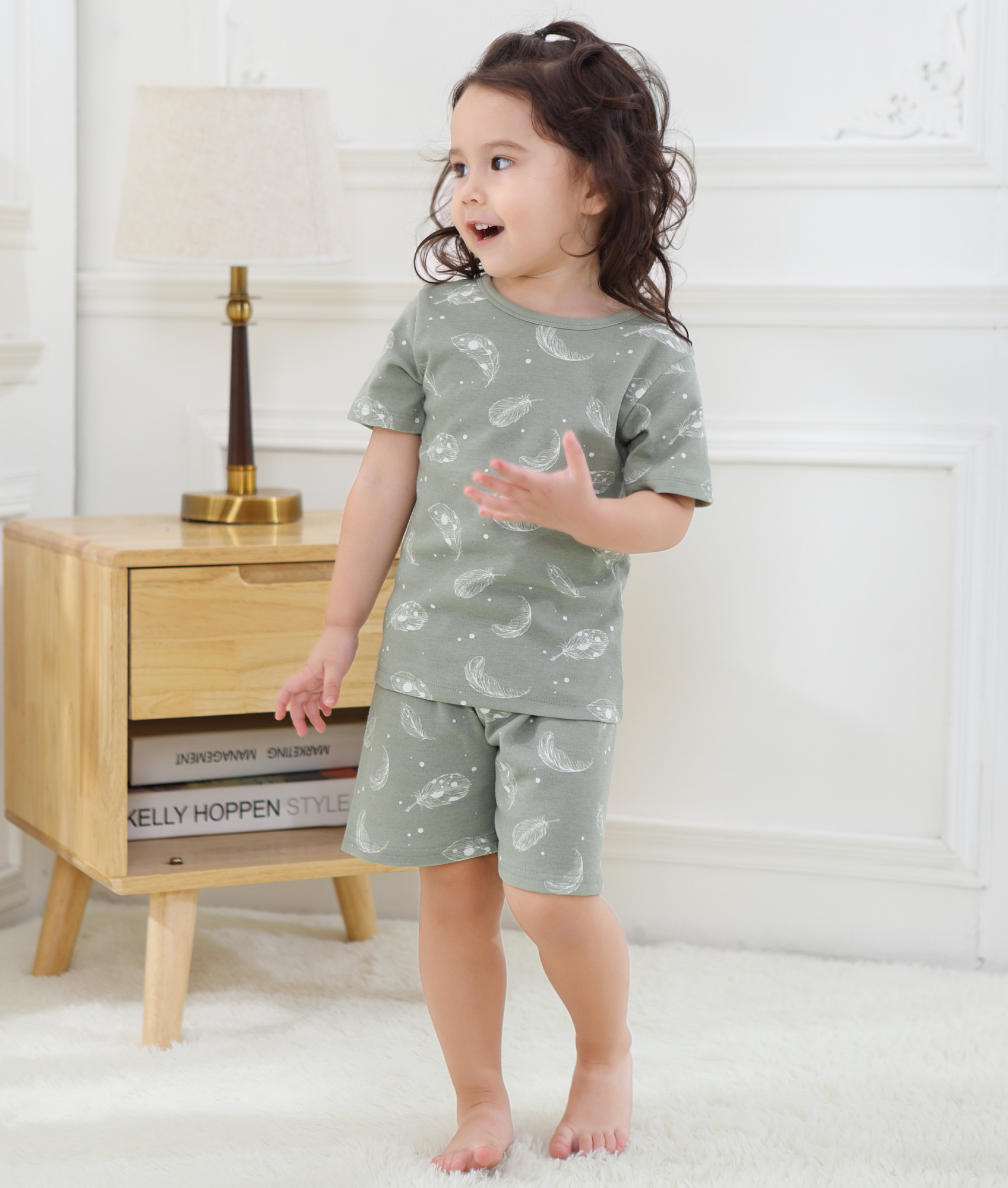 100% Organic Cotton Toddler Summer 2 Piece short sleeve Pajama Set - Green Feather