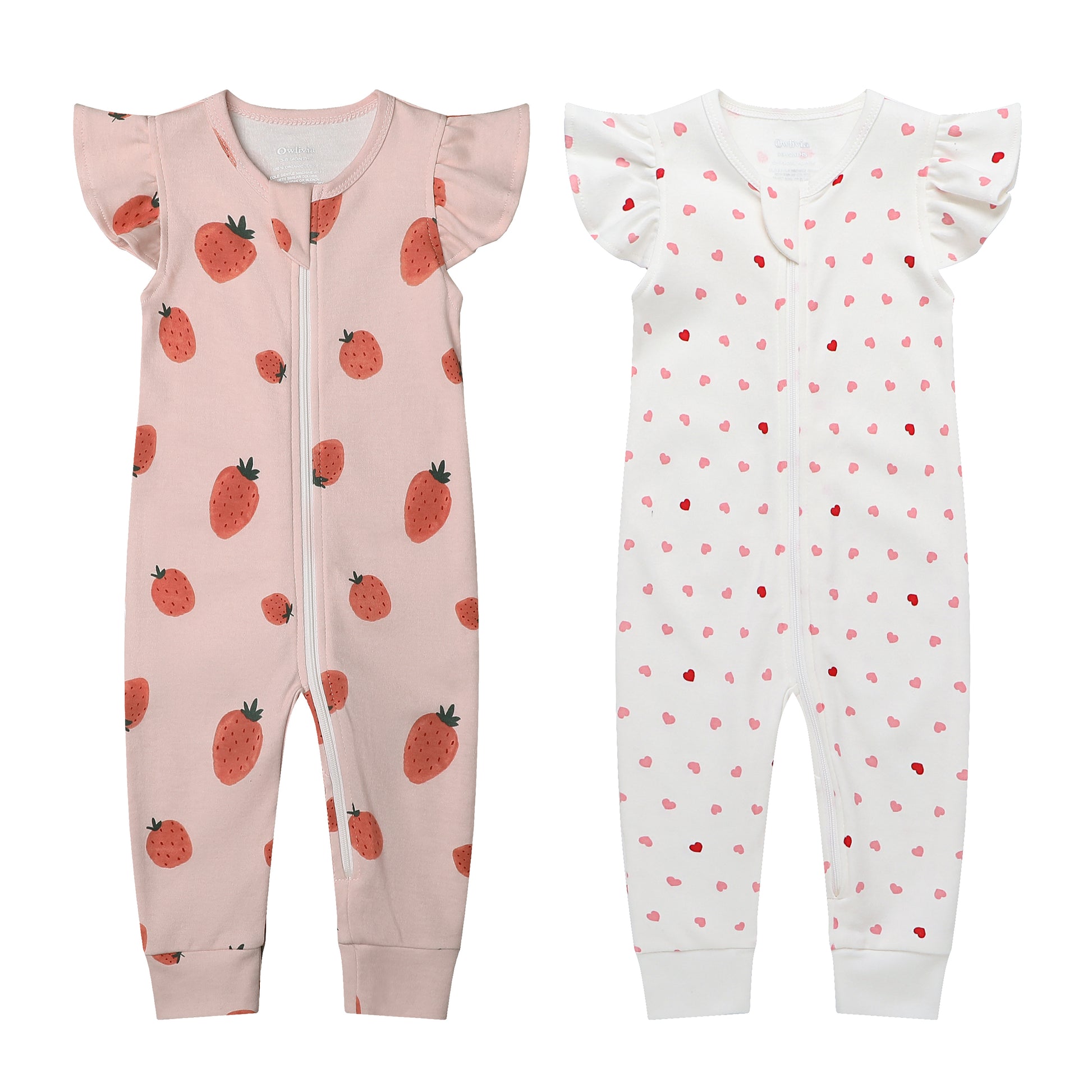 100% Organic Cotton Zip Footless Short Sleeve Pajamas - Ruffle Pink Heart & Pink Strawberry